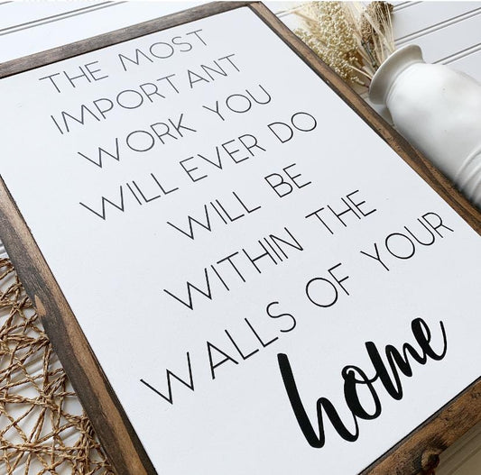 The Most Important Work You Will Ever Do Will Be Within The Walls of Your Home Framed Wood Sign