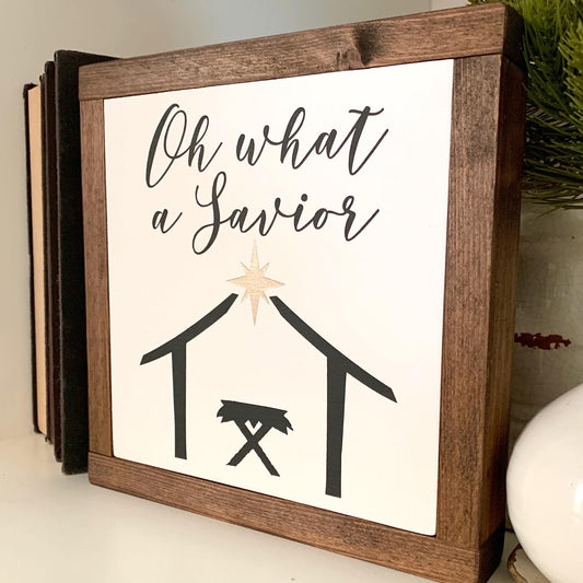 Oh What A Savior Nativity Framed Wood Sign
