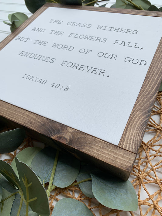 The Grass Withers and the Flowers Fall But the Word of the Lord Endures Forever Framed Wood Sign