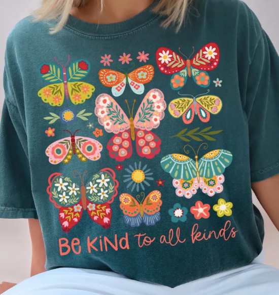 Spread positivity and style with our "Be Kind to All Kinds" butterfly t-shirt. This uplifting graphic tee features a vibrant collection of whimsical butterflies and flowers, paired with a meaningful message that encourages kindness, inclusivity, and love for all.