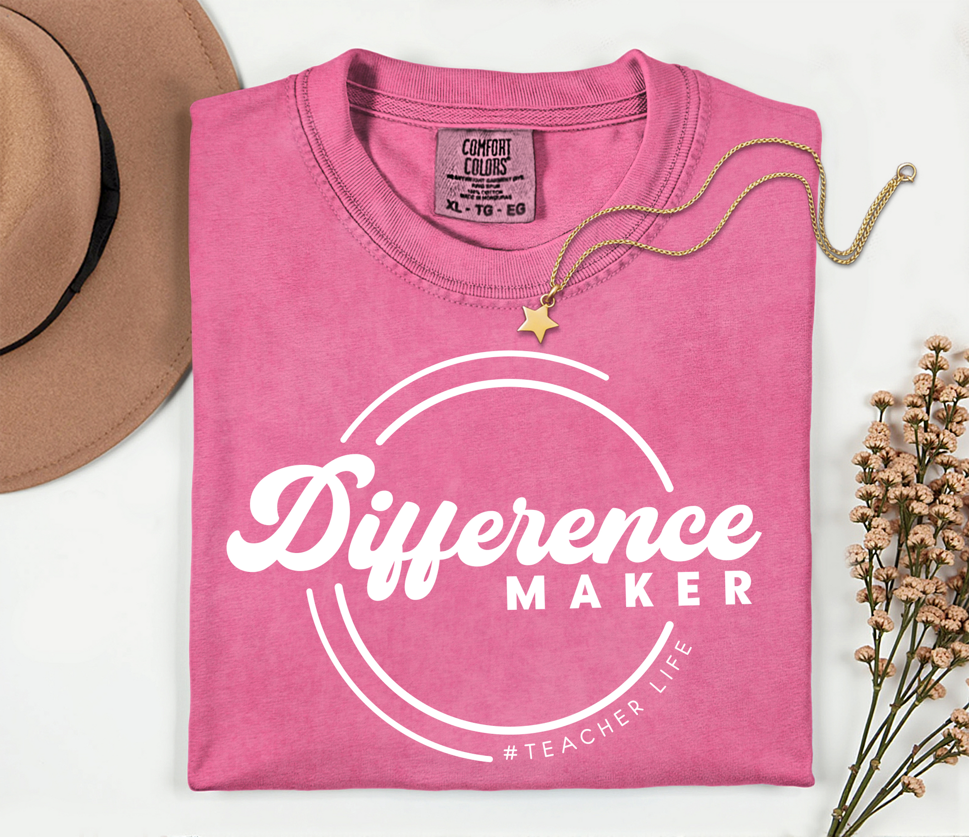 Celebrate your impact in style with our "Difference Maker" Comfort Colors t-shirt - a perfect reminder that what you do truly matters. Designed for passionate educators and classroom heroes, this soft-washed, garment-dyed tee combines comfort, quality, and inspiration in one stylish piece.