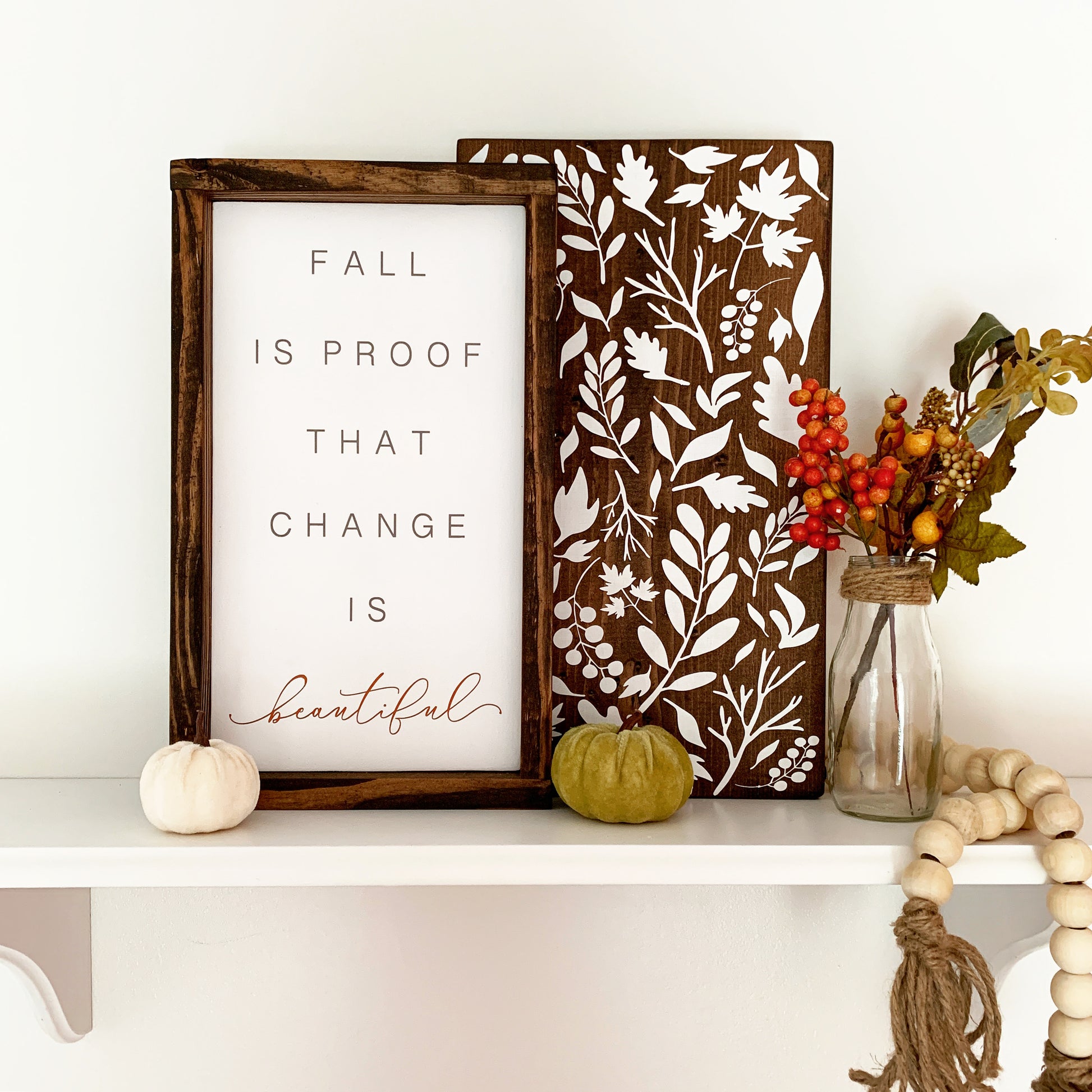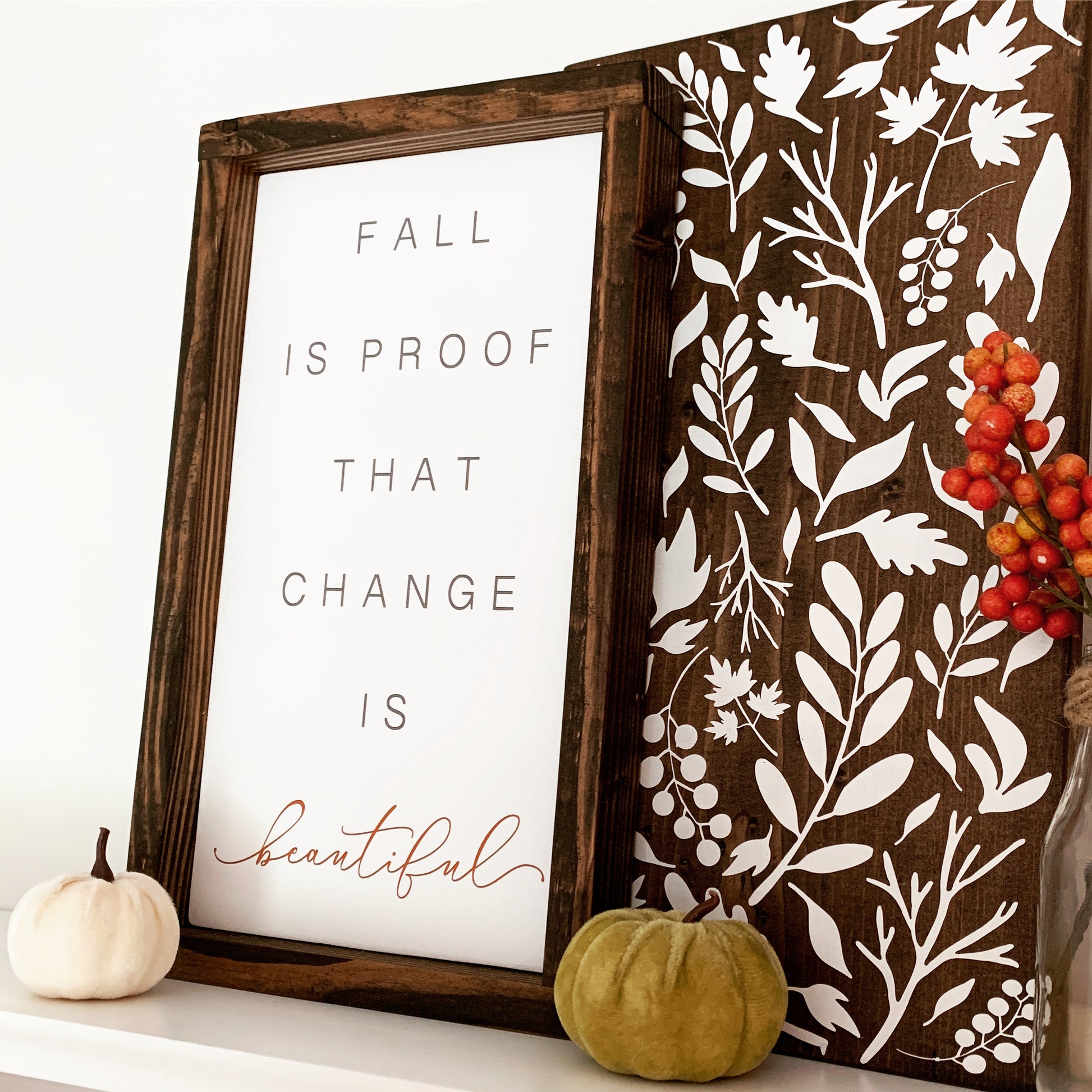 To purchase the "Fall Is Proof That Change Is Beautiful" AND the layered white botanical leaf sign pictured, please choose the bundle labeled "Fall Is" + "Leaves." (Please note that each board is unique with its own wood grain and knot pattern. The final product will not be identical to the leaf pattern boards pictured as each wood carries its own beauty and grain.) The "Fall Is Proof" selection is only for the framed sign pictured and will not include the stained wooden piece with the white leaf pattern. To purchase ONLY the leaf pattern sign, you may do so at this link : https://spreadinghopedesigns.com/products/botanical-leaf-wood-sign