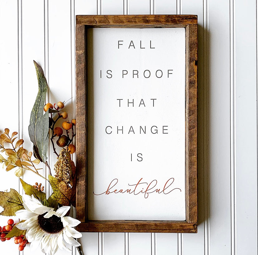 Embrace the beauty of fall with this charming wood sign, perfect for adding a touch of seasonal warmth to your home. Featuring the inspirational quote "Fall is Proof That Change is Beautiful," this handcrafted sign is framed with rustic wood, making it a stylish addition to your entryway, living room, or kitchen decor.