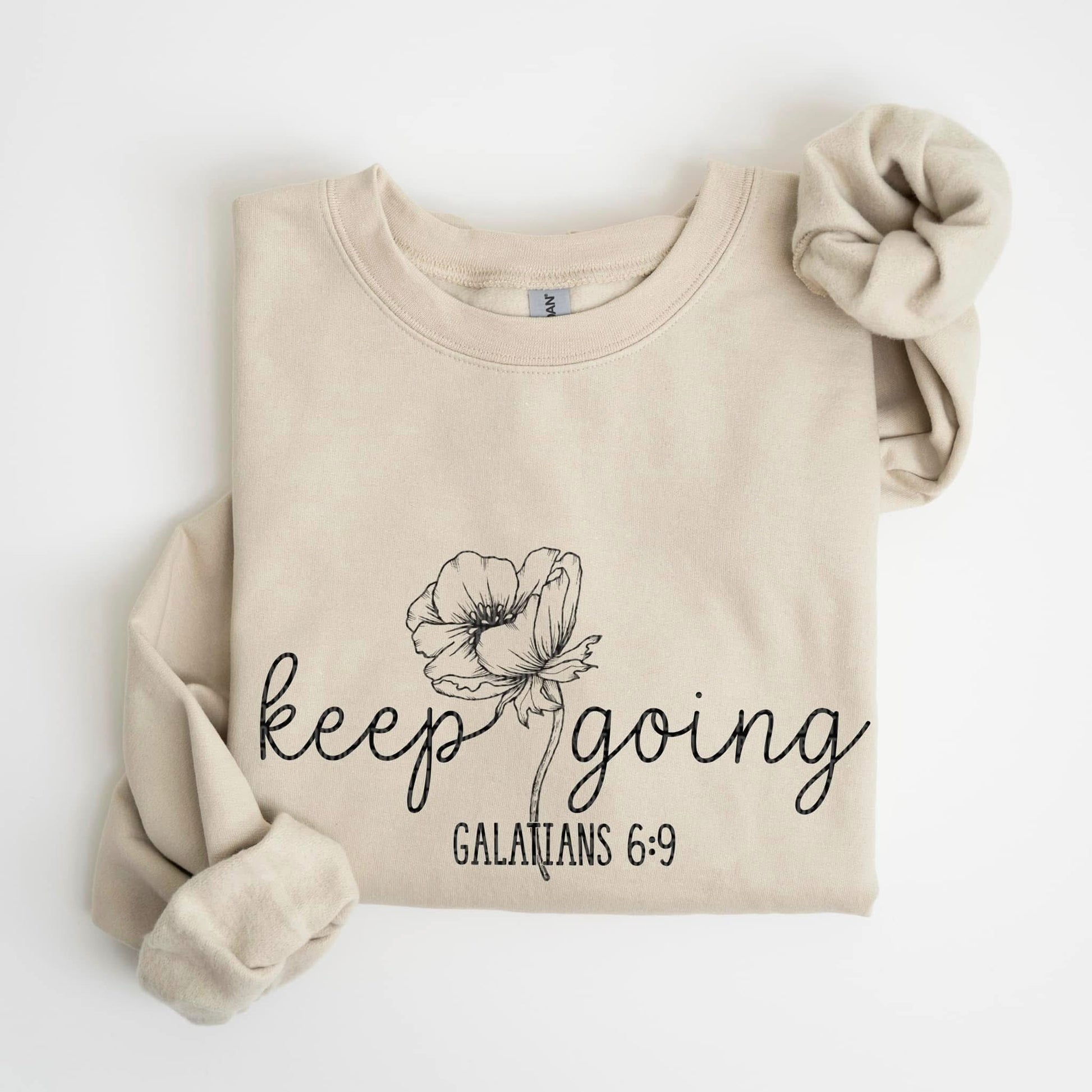Inspired by the verse Galatians 6:9, this cozy, delicate, and hopeful sweatshirt design reminds us to not grow weary in doing good, for we will reap a harvest if we do not give up. "Keep Going."