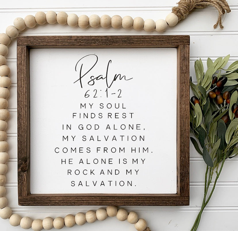 Bring a touch of faith and rustic charm to your home with this beautifully crafted wooden framed sign featuring the scripture Psalm 62:1-2. The white background and painted black lettering create a striking contrast that ensures the scripture stands out, making it a perfect piece for any room in your home. The measurements of this sign are 13"x13".