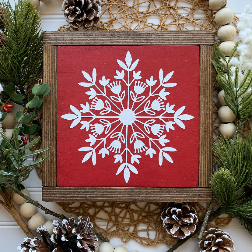 Red Snowflake Framed Wood Sign