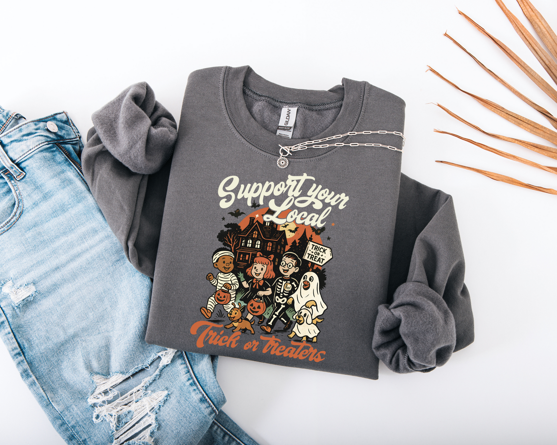 Celebrate spooky season in style with this cozy Halloween sweatshirt! Featuring a retro-inspired design of kids dressed up as a mummy, skeleton, and ghost, this sweatshirt reminds everyone to "Support Your Local Trick or Treaters." Perfect for pumpkin carving, handing out candy, haunted houses, or staying comfy on cool autumn nights.