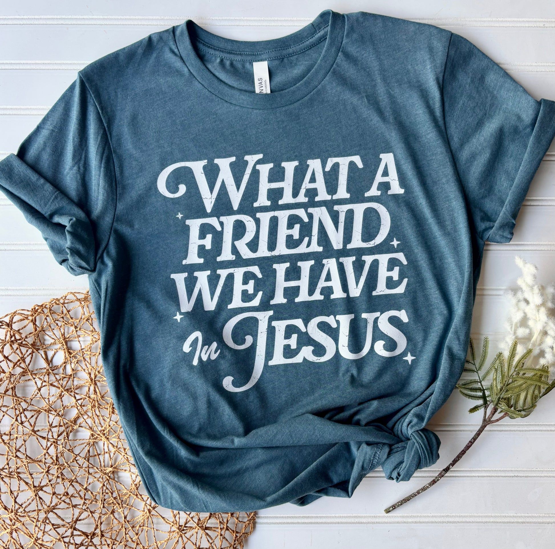 Celebrate your faith with style and comfort with our “What a Friend We Have in Jesus” graphic t-shirt. Designed to inspire and uplift, this shirt is perfect for anyone looking to share their love for Christ in a fashionable and meaningful way. Made from a soft, breathable cotton blend, ensuring all-day comfort and durability, and a relaxed, unisex design perfect for everyday wear, whether you’re at church, running errands, or lounging at home.